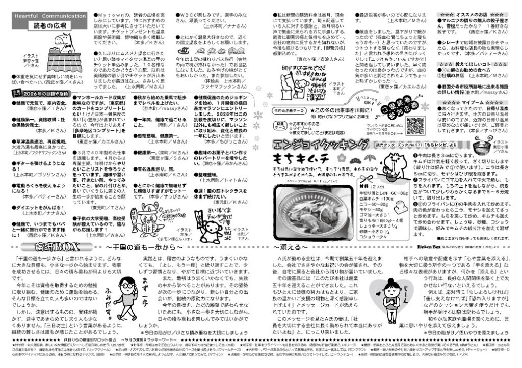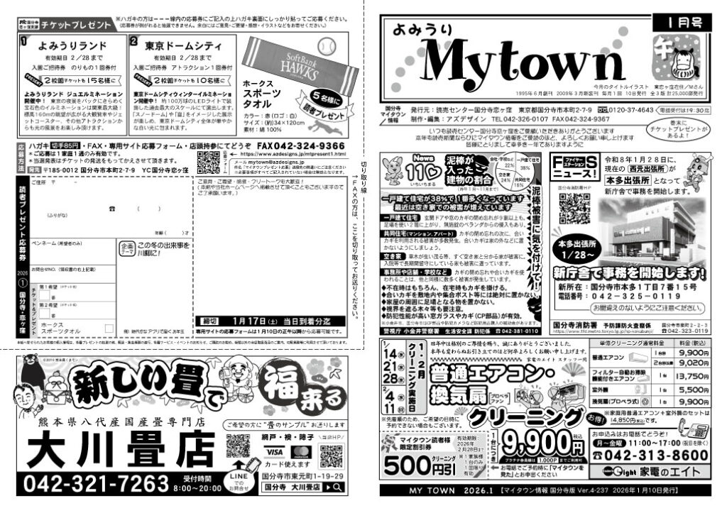 読者プレゼント応募はコチラから タウン情報紙「マイタウン情報」を毎月1回発行。10日の朝刊折り込みにてお届けします。 読者プレゼントやお料理コーナー、皆様から寄せられたコメントなどを掲載しております。 姉妹紙・東林間マイタウン情報へ→ 2025年版はコチラ⇒ 2024年版はコチラ⇒ 2023年版はコチラ⇒ 2022年版はコチラ⇒ 2026年1月号 2026年1月号/外面 2026年1月号/中面 マイタウン情報 トップページへ